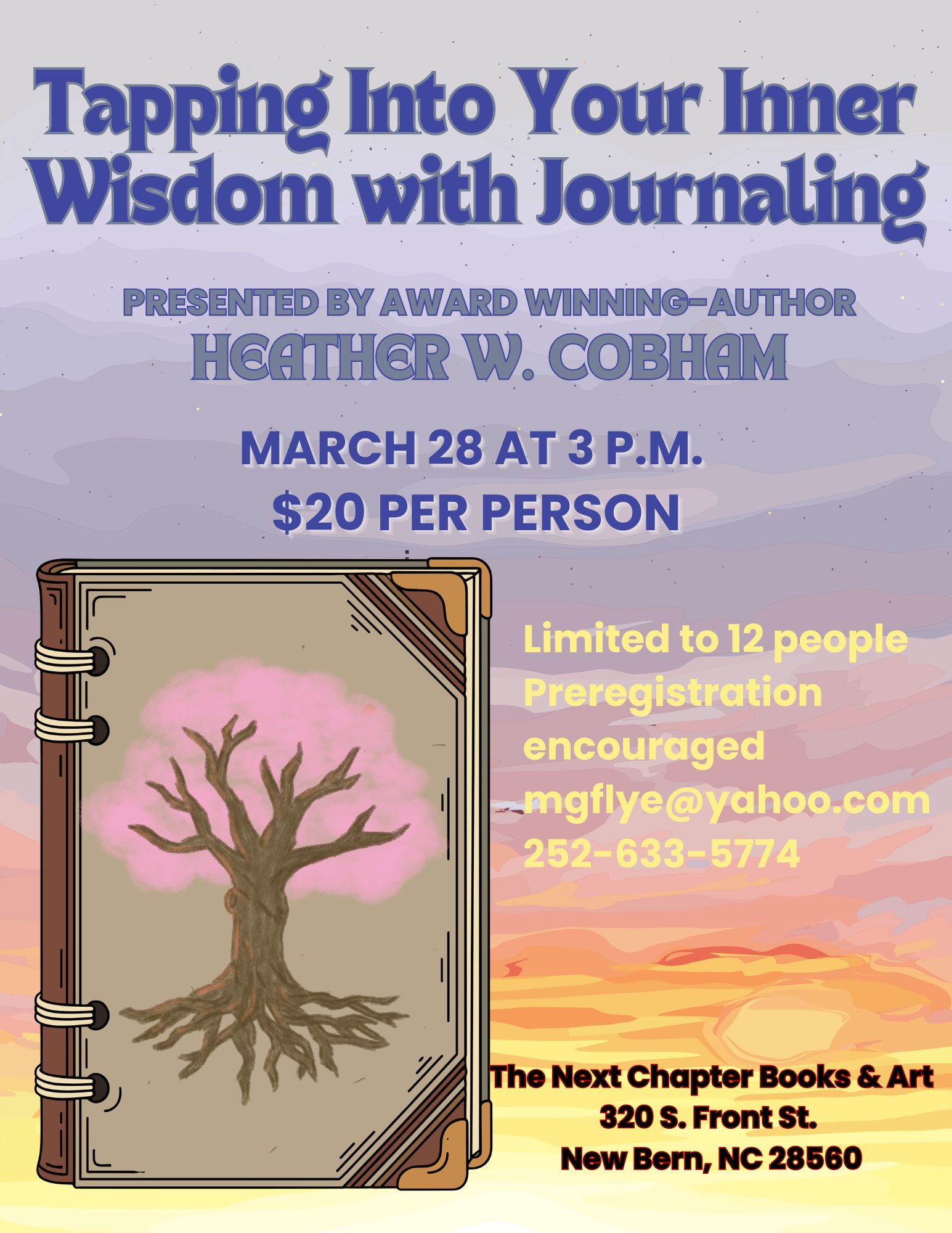 March 28 3 p.m. “Tapping Into Your Inner Wisdom with Journaling” workshop by award-winning author Heather W. Cobham. Space limited, cost $20 per person, RSVP michellegflye@gmail.com