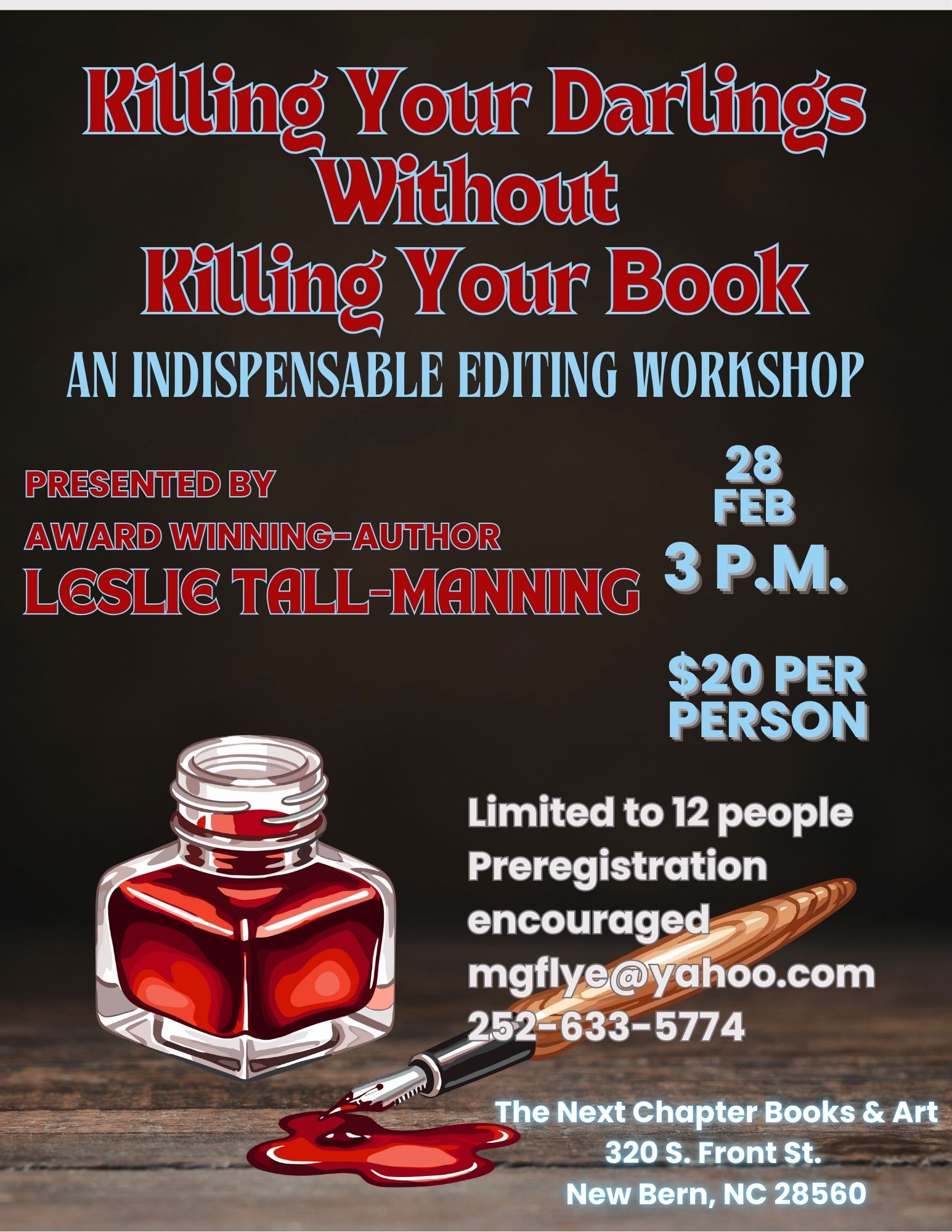 February 28 3 p.m. “Killing Your Darlings Without Killing Your Book: An Essential Editing Workshop” by award-winning author Leslie Tall Manning. Space limited, cost $20 per person, RSVP michellegflye@gmail.com